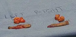 The fat is held with forceps (left), and clamped with a hemostat (right), while a small medical retractor keeps away the extra tissue, so that the surgeon can operate (bottom right).
