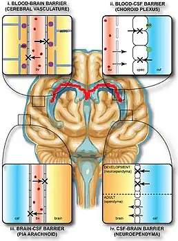 - ↑ Pardridge WM (January 2011). "Drug transport in brain via the cerebrospinal fluid". Fluids and Barriers of the CNS. 8 (1): 7. doi:10.1186/2045-8118-8-7. PMC 3042981. PMID 21349155.