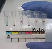 Blood typing can be performed using test tubes, microplates, or blood typing slides. The tube method involves mixing a suspension of red blood cells with antisera (or plasma, for reverse grouping) in a test tube. The mixture is centrifuged to separate the cells from the reagent, and then resuspended by gently agitating the tube. If the antigen of interest is present, the red blood cells agglutinate, forming a solid clump in the tube. If it is absent, the red blood cells go back into suspension when mixed.[7]: 611–12 [9]: 214 The microplate method is similar to the tube method, except rather than using individual test tubes, blood typing is carried out in a plate containing dozens of wells, allowing multiple tests to be performed at the same time. The agglutination reactions are read after the plate is centrifuged.[21]: 201