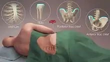 Bone marrow aspiration and trephine biopsy are usually performed on the back of the hipbone, or posterior iliac crest. An aspirate can also be obtained from the sternum (breastbone). For the sternal aspirate, the patient lies on their back, with a pillow under the shoulder to raise the chest. A trephine biopsy should never be performed on the sternum, due to the risk of injury to blood vessels, lungs or the heart. Bone marrow aspiration may also be performed on the tibial (shinbone) site in children up to 2 years of age while spinous process aspiration is frequently done in a lumbar puncture position and on the L3-L4 vertebrae.