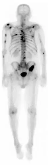 In the 1950s and 1960s calcium-45 was investigated, but as a beta emitter proved difficult to image. Imaging of positron and gamma emitters such as fluorine-18 and isotopes of strontium with rectilinear scanners was more useful.[8][9] Use of technetium-99m (99mTc) labelled phosphates, diphosphonates or similar agents, as in the modern technique, was first proposed in 1971.[10][11]