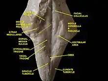 Superior to the obex is the floor of the fourth ventricle. In the floor of the fourth ventricle, various nuclei can be visualized by the small bumps that they make in the overlying tissue. In the midline and directly superior to the obex is the vagal trigone and superior to that it the hypoglossal trigone. Underlying each of these are motor nuclei for the respective cranial nerves. Superior to these trigones are fibers running laterally in both directions. These fibers are known collectively as the striae medullares. Continuing in a rostral direction, the large bumps are called the facial colliculi. Each facial colliculus, contrary to their names, do not contain the facial nerve nuclei. Instead, they have facial nerve axons traversing superficial to underlying abducens (CN VI) nuclei. Lateral to all these bumps previously discussed is an indented line, or sulcus that runs rostrally, and is known as the sulcus limitans. This separates the medial motor neurons from the lateral sensory neurons. Lateral to the sulcus limitans is the area of the vestibular system, which is involved in special sensation. Moving rostrally, the inferior, middle, and superior cerebellar peduncles are found connecting the midbrain to the cerebellum. Directly rostral to the superior cerebellar peduncle, there is the superior medullary velum and then the two trochlear nerves. This marks the end of the pons as the inferior colliculus is directly rostral and marks the caudal midbrain. Middle cerebellar peduncle is located inferior and lateral to the superior cerebellar peduncle, connecting pons to the cerebellum. Likewise, inferior cerebellar peduncle is found connecting the medulla oblongata to the cerebellum.