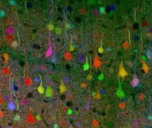 Brainbow was initially developed by Jeff W. Lichtman and Joshua R. Sanes at Washington University in St. Louis.[1] The team constructed Brainbow using a two-step process: first, a specific genetic construct was generated that could be recombined in multiple arrangements to produce one of either three or four colors based on the particular fluorescent proteins (XFPs) being implemented.[4] Next, multiple copies of the same transgenic construct were inserted into the genome of the target species, resulting in the random expression of different XFP ratios and subsequently causing different cells to exhibit a variety of colorful hues.[4]
