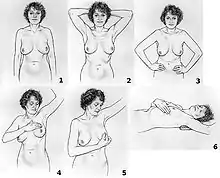 {{cite web}}:|author=has generic name (help) - ↑ Saslow D, Hannan J, Osuch J, Alciati MH, Baines C, Barton M, Bobo JK, Coleman C, Dolan M, Gaumer G, Kopans D, Kutner S, Lane DS, Lawson H, Meissner H, Moorman C, Pennypacker H, Pierce P, Sciandra E, Smith R, Coates R (2004). "Clinical breast examination: practical recommendations for optimizing performance and reporting". CA: A Cancer Journal for Clinicians. 54 (6): 327–44. doi:10.3322/canjclin.54.6.327. PMID 15537576.