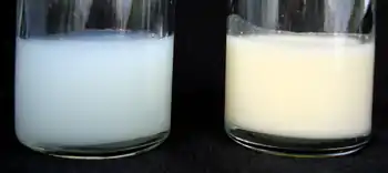 Breasts begin producing mature milk around the third or fourth day after birth. Early in a nursing session, the breasts produce foremilk, a thinner milk containing many proteins and vitamins. If the baby keeps nursing, then hindmilk is produced. Hindmilk has a creamier color and texture because it contains more fat.[28]