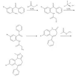 Subsequently, through the aid of acetohydrazide, another acylation event takes place, giving rise to a 1,2,4-triazole ring and ultimately yielding the synthesis of Bromazolam.[14][17][18][19] The synthesis of Bromazolam is shown below.