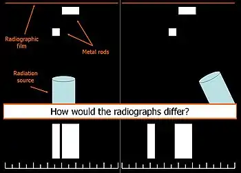 - Expose another film while angle of the x-ray beam has been changed. If an object moves in the same direction as the source of the x-ray beam, it is lingual to the other object. If the object moves in the opposite direction of the source, it is buccal to the other object.