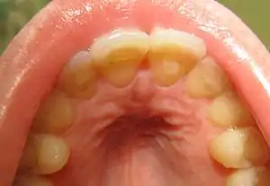 Loss of enamel (acid erosion) from the inside of the upper front teeth as a result of bulimia