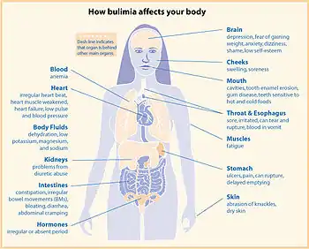 Bulimia nervosa, also known as simply bulimia, is an eating disorder characterized by binge eating followed by purging.[2] Binge eating refers to eating a large amount of food in a short amount of time.[2] Purging refers to the attempts to get rid of the food consumed.[2] This may be done by vomiting or taking laxatives.[2] Other efforts to lose weight may include the use of diuretics, stimulants, water fasting, or excessive exercise.[2][4] Most people with bulimia are at a normal weight.[1] The forcing of vomiting may result in thickened skin on the knuckles and breakdown of the teeth.[2] Bulimia is frequently associated with other mental disorders such as depression, anxiety, and problems with drugs or alcohol.[2] There is also a higher risk of suicide and self-harm.[3]