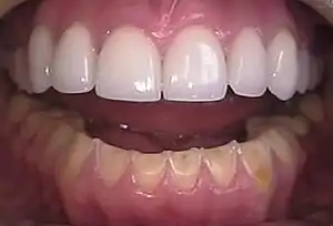 The erosion on the lower teeth was caused by bulimia. For comparison, the upper teeth were restored with porcelain veneers.[11]