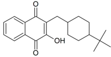 Buparvaquone is a naphthoquinone antiprotozoal drug related to atovaquone. It is a promising compound for the therapy and prophylaxis of all forms of theileriosis. Buparvaquone has been shown to have anti-leishmanial activity in vitro. It can be used to treat bovine East Coast fever protozoa in vitro, along with the only other substance known – Peganum harmala. It is the only really effective commercial therapeutic product against bovine theileriosis, where it has been used since the late 1980s.