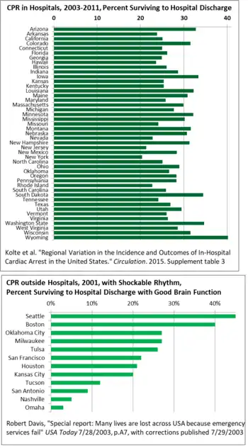 Studies have shown that immediate CPR followed by defibrillation within 3–5 minutes of sudden VF cardiac arrest dramatically improves survival. In cities such as Seattle where CPR training is widespread and defibrillation by EMS personnel follows quickly, the survival rate is about 20 percent for all causes and as high as 57 percent if a witnessed "shockable" arrest.[66] In cities such as New York, without those advantages, the survival rate is only 5 percent for witnessed shockable arrest.[67] Similarly in-hospital CPR is more successful when arrests are witnessed or are in the ICU or in patients wearing heart monitors, where the arrests are noticed immediately, as shown in the table and graph later in this article.[68][69]