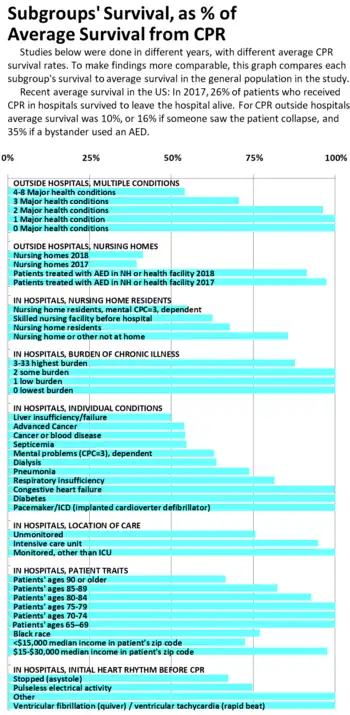 Survival rates: In 2017 in the US, outside hospitals, 16% of people whose cardiac arrest was witnessed survived to hospital discharge.[82] Among those who went into cardiac arrest in US hospitals in 2017, 26% who received CPR survived to hospital discharge.[83]: e381, e390 [84]