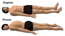Standard CPR is performed with the victim in supine position. Prone CPR, or reverse CPR, is performed on a victim in prone position, lying on the chest. This is achieved by turning the head to the side and compressing the back. Due to the head being turned, the risk of vomiting and complications caused by aspiration pneumonia may be reduced.[33]
