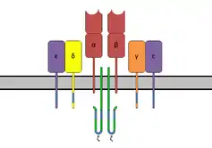 - ↑ Zheng L, Lin J, Zhang B, Zhu Y, Li N, Xie S, et al. (September 2019). "Structural basis of assembly of the human T cell receptor-CD3 complex". Nature. 573 (7775): 546–552. Bibcode:2019Natur.573..546D. doi:10.1038/s41586-019-1537-0. PMID 31461748. S2CID 201665009.