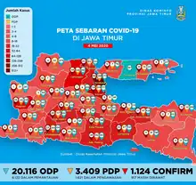 The COVID-19 pandemic in Indonesia is part of the worldwide pandemic of coronavirus disease 2019 (COVID-19) caused by severe acute respiratory syndrome coronavirus 2 (SARS-CoV-2). It was confirmed to have spread to Indonesia on 2 March 2020, after a dance instructor and her mother tested positive for the virus. Both were infected from a Japanese national.[3][4]