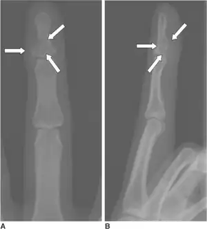 | Calcifying aponeurotic fibroma-a,b)Show eccentrically located osteolytic lesion at base of distal phalanx | |