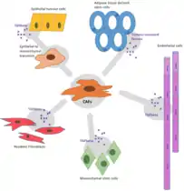 CAFs can also be derived from differentiation of other cell types such as mesenchymal stem cells, which was proved in murine models with cancers such as glioma, breast, pancreatic and gastric cancers.[27] Another suggested origin is differentiation of endothelial or epithelial cells via trans-differentiation or epithelial to mesenchymal transition, respectively.[28][29]