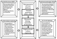 Cancer genome sequencing utilizes the same technology involved in whole genome sequencing. The history of sequencing has come a long way, originating in 1977 by two independent groups - Fredrick Sanger’s enzymatic didoxy DNA sequencing technique [26] and the Allen Maxam and Walter Gilbert chemical degradation technique.[27] Following these landmark papers, over 20 years later ‘Second Generation’ high-throughput next generation sequencing (HT-NGS) was born followed by ‘Third Generation HT-NGS technology’ in 2010.[28] The figures to the right illustrate the general biological pipeline and companies involved in second and third generation HT-NGS sequencing.