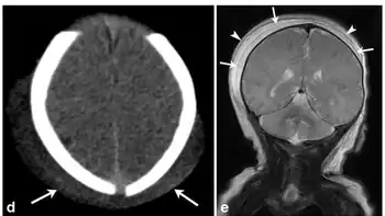 d)Axial CT image in a male infant with history of traumatic delivery demonstrate scalp soft tissue overlying bilateral parietal regions and crossing the sagittal suture e) demonstrates a deep subaponeurotic scalp fluid collection crossing the sagittal suture and extending anteriorly into the right temporal region, consistent with subgaleal hematoma, superficial overlying fluid collection with a similar distribution also noted; collection is within the subcutaneous fibrofatty tissues superficial to galea aponeurosis and is consistent with caput succedaneum
