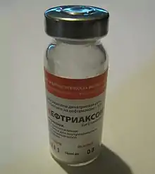 Ceftriaxone, sold under the brand name Rocephin, is an antibiotic used for the treatment of a number of bacterial infections.[1] These include middle ear infections, endocarditis, meningitis, pneumonia, bone and joint infections, intra-abdominal infections, skin infections, urinary tract infections, gonorrhea, and pelvic inflammatory disease.[1] It is also sometimes used before surgery and following a bite wound to try to prevent infection.[1] Ceftriaxone can be given by injection into a vein or into a muscle.[1]