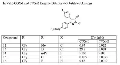- 1 2 3 Penning TD, Talley JJ, Bertenshaw SR, Carter JS, Collins PW, Docter S, Graneto MJ, Lee LF, Malecha JW, Miyashiro JM, Rogers RS, Rogier DJ, Yu SS, Burton EG, Cogburn JN, Gregory SA, Koboldt CM, Perkins WE, Seibert K, Veenhuizen AW, Zhang YY, Isakson PC (April 1997). "Synthesis and biological evaluation of the 1,5-diarylpyrazole class of cyclooxygenase-2 inhibitors: identification of 4-[5-(4-methylphenyl)-3-(trifluoromethyl)-1H-pyrazol-1-yl]benze nesulfonamide (SC-58635, celecoxib)". Journal of Medicinal Chemistry. 40 (9): 1347–65. doi:10.1021/jm960803q. PMID 9135032.