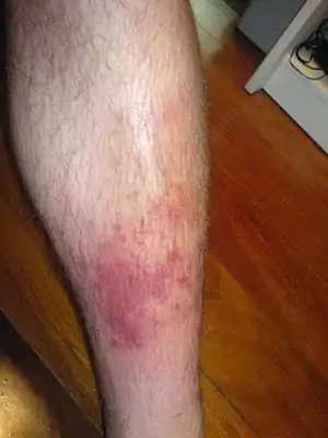 | Differential diagnosis | Deep vein thrombosis, stasis dermatitis, erysipelas, Lyme disease, necrotizing fasciitis[1][4][5] |