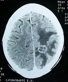 The cause of most brain tumors is unknown.[2] Uncommon risk factors include exposure to vinyl chloride, Epstein–Barr virus, ionizing radiation, and inherited syndromes such as neurofibromatosis, tuberous sclerosis, and von Hippel-Lindau Disease.[1][2][3] Studies on mobile phone exposure have not shown a clear risk.[3] The most common types of primary tumors in adults are meningiomas (usually benign) and astrocytomas such as glioblastomas.[1] In children, the most common type is a malignant medulloblastoma.[3] Diagnosis is usually by medical examination along with computed tomography (CT) or magnetic resonance imaging (MRI).[2] The result is then often confirmed by a biopsy.[1] Based on the findings, the tumors are divided into different grades of severity.[1]