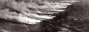 Germany, the first side to employ chemical warfare on the battlefield,[32] simply opened canisters of chlorine upwind of the opposing side and let the prevailing winds do the dissemination. Soon after, the French modified artillery munitions to contain phosgene – a much more effective method that became the principal means of delivery.[33]