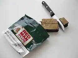 Plug chewing tobacco is tobacco leaves pressed into a square, brick-like mass called a plug. From this, pieces are bitten off or cut from the plug and then chewed. Plug tobacco is declining in popularity, thus less readily available than loose-leaf chewing tobacco. Historically, plug tobacco could be either smoked in a pipe or chewed, but today, these are two distinct products.