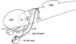 The optic chiasm of vertebrates involves the optic tract. The trochlear nerve is a motor nerve that innervates one of the muscles that move the contralateral eye (i.e., the superior oblique muscle). It emerges from the dorsal aspect of the ventral midbrain, leaves the brain on the dorsal side where it crosses to the opposite side. The oculomotor nerve originates from the third nerve nucleus at the level of the superior colliculus (in non-mammalian vertebrates this is the optic tectum) in the midbrain. The rostral part of the nerve crosses the midline to merge with the part of the contralateral nerve that does not cross. Since the midline crossing occurs inside the brain, it is not strictly a chiasm but rather a decussation.