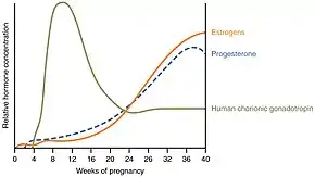 During the later stages of gestation there is an increase in abundance of oxytocin, a hormone that is known to evoke feelings of contentment, reductions in anxiety, and feelings of calmness and security around the mate.[27] Oxytocin is further released during labour when the fetus stimulates the cervix and vagina, and it is believed that it plays a major role in the bonding of a mother to her infant and in the establishment of maternal behavior. The act of nursing a child also causes a release of oxytocin.[28]