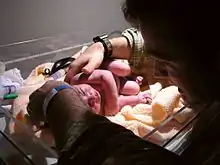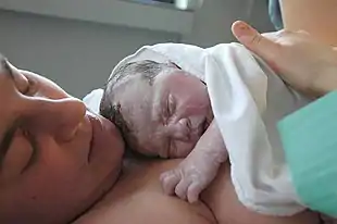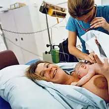 As of 2014, early postpartum skin-to-skin contact is endorsed by all major organizations that are responsible for the well-being of infants, including the American Academy of Pediatrics.[72] The World Health Organization (WHO) states that "the process of childbirth is not finished until the baby has safely transferred from placental to mammary nutrition." They advise that the newborn be placed skin-to-skin with the mother, postponing any routine procedures for at least one to two hours. The WHO suggests that any initial observations of the infant can be done while the infant remains close to the mother, saying that even a brief separation before the baby has had its first feed can disturb the bonding process. They further advise frequent skin-to-skin contact as much as possible during the first days after delivery, especially if it was interrupted for some reason after the delivery.[73] The National Institute for Health and Care Excellence also advises postponing procedures such as weighing, measuring, and bathing for at least one hour to insure an initial period of skin-to-skin contact between mother and infant.[74]