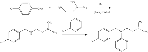 The preparation begins with the condensation of 4-chlorobenzaldehyde with 1,1-dimethyethylenediamine. The resulting Schiff base is reduced. The resulting amine is then further reacts with 2-bromopyridine in the presence of sodamide.