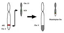 | The Philadelphia chromosome as seen by fluorescent in situ hybridization (FISH). | |