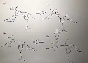 - The cysteine makes a bond with the carbon breaking the carbon's double bond with oxygen and converting it into a simple bond.