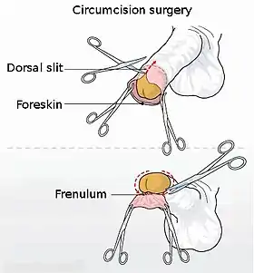 Circumcision is the removal of the foreskin from the human penis.[1][2] In the most common procedure, the foreskin is opened, adhesions are removed, and the foreskin is separated from the glans. After that, a circumcision device may be placed, and then the foreskin is cut off. Topical or locally injected anesthesia is used to reduce pain and physiologic stress.[3] The procedure is most often an elective surgery performed on babies and children for religious or cultural reasons.[4] Medically, circumcision is a treatment option for problematic cases of phimosis and balanoposthitis that do not resolve with other treatments, and for chronic urinary tract infections (UTIs).[5][6] It is contraindicated in cases of certain genital structure abnormalities or poor general health.[1][6]