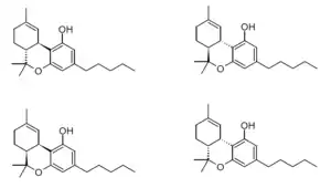 Clockwise from top left: "Natural" Δ9-THC, Unnatural Δ9-THC, (+)-cis-Δ9-THC and (-)-cis-Δ9-THC