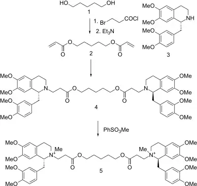 Treatment of 1,5-Pentanediol with 3-bromopropionyl chloride gives the corresponding ester; dehydrohalogenation of the ester with triethylamine then gives the bis-acrylate (2). Reaction of that unsaturated ester with tetrahydropapaverine[16][17] (3) leads to conjugate addition of the secondary amine and formation of the intermediate (4). Alkylation with methyl benzenesulfonate forms the bis-quaternary salt, affording cisatracuronium (5).