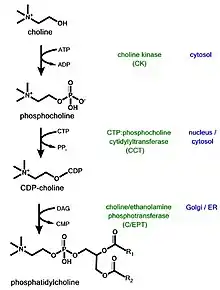 - ↑ Fernández-Murray JP, McMaster CR (Nov 2005). "Glycerophosphocholine catabolism as a new route for choline formation for phosphatidylcholine synthesis by the Kennedy pathway". The Journal of Biological Chemistry. 280 (46): 38290–6. doi:10.1074/jbc.M507700200. PMID 16172116.