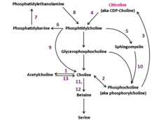 - ↑ Lopez G-Coviella I, Agut J, Von Borstel R, Wurtman RJ (January 1987). "Metabolism of cytidine (5?)-diphosphocholine (cdp-choline) following oral and intravenous administration to the human and the rat". Neurochemistry International. 11 (3): 293–297. doi:10.1016/0197-0186(87)90049-0. PMID 20501174. S2CID 25557979.