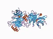 Clathrin is a protein that plays a major role in the formation of coated vesicles. Clathrin was first isolated by Barbara Pearse in 1976.[1] It forms a triskelion shape composed of three clathrin heavy chains and three light chains. When the triskelia interact they form a polyhedral lattice that surrounds the vesicle. The protein's name refers to this lattice structure, deriving from Latin clathri meaning lattice.[2] Barbara Pearse named the protein clathrin at the suggestion of Graeme Mitchison, selecting it from three possible options.[3] Coat-proteins, like clathrin, are used to build small vesicles in order to transport molecules within cells. The endocytosis and exocytosis of vesicles allows cells to communicate, to transfer nutrients, to import signaling receptors, to mediate an immune response after sampling the extracellular world, and to clean up the cell debris left by tissue inflammation. The endocytic pathway can be hijacked by viruses and other pathogens in order to gain entry to the cell during infection.[4]