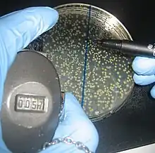 The traditional way of enumerating CFUs with a "click-counter" and a pen. When the colonies are too numerous, it is common practice to count CFUs only on a fraction of the dish.