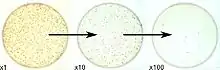 A solution of bacteria at an unknown concentration is often serially diluted in order to obtain at least one plate with a countable number of bacteria. In this figure, the "x10" plate is suitable for counting.