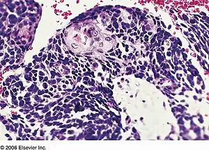 EGFR-TKI's have been found to be active against variants exhibiting certain mutations in the EGFR gene.[58][59][60][61] While EGFR mutations are very rare (<5%) in "pure" SCLC, they are considerably more common (about 15–20%) in c-SCLC,[62][63] particularly in non-smoking females whose c-SCLC tumors contain an adenocarcinoma component. These patients are much more likely to have classical EGFR mutations in the small cell component of their tumors as well, and their tumors seem to be more likely to respond to treatment with EGFR-TKI's.[63][64][65] EGFR-targeted agents appear particularly effective in papillary adenocarcinoma,[66][67] non-mucinous bronchioloalveolar carcinoma,[68] and adenocarcinoma with mixed subtypes.[67]