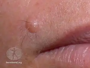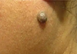 Dermal nevus, also known as intradermal nevus, is a light or fleshy-colored small bump in skin, typically occurring in adults.[3] It may be a larger bump and have a protruding hair.[3] It is the commonest type of melanocytic nevus.[3]