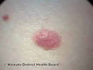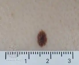 A common mole, also known as benign melanocytic nevus is a noncancerous pigmented spot or small bump in skin.[1] They are described as either junctional, compound, or dermal, and are typically less than 5mm in diameter, and mostly symmetrical and uniform in color.[2] Broadly; junctional nevus is a flat brown-black spot, dermal nevus is light or fleshy-colored and slightly elevated, and compound nevus is fleshy-colored to brown domes which sometimes appear as though it may fall off.[3]