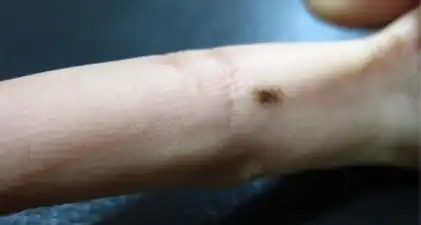Junctional nevus appears as a brown to black well-defined flat marking in skin, typically appearing in childhood and adolescents; 3 to 18 years of age.[1] It can become a dermal or compound nevus later on.[1] In a nail it appears as a longitudinal line.[3]