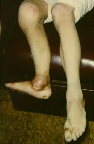 | Charcot joints are shown in this boy with CIPA. His right knee and right ankle are enlarged and distorted. The skin over the medial aspect of the ankle is darkened with a draining wound secondary to superimposed osteomyelitis. There are other areas of trauma and ulcers including a site on the right heel. | |