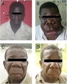 Conidiobolomycosis is a long term fungal infection that is typically found just under the skin of the nose, sinuses, cheeks and upper lips.[2][3] It may present with a nose bleed or a blocked or runny nose.[3] Typically there is a firm painless swelling which can slowly extend to the nasal bridge and eyes, sometimes causing facial disfigurement.[5]